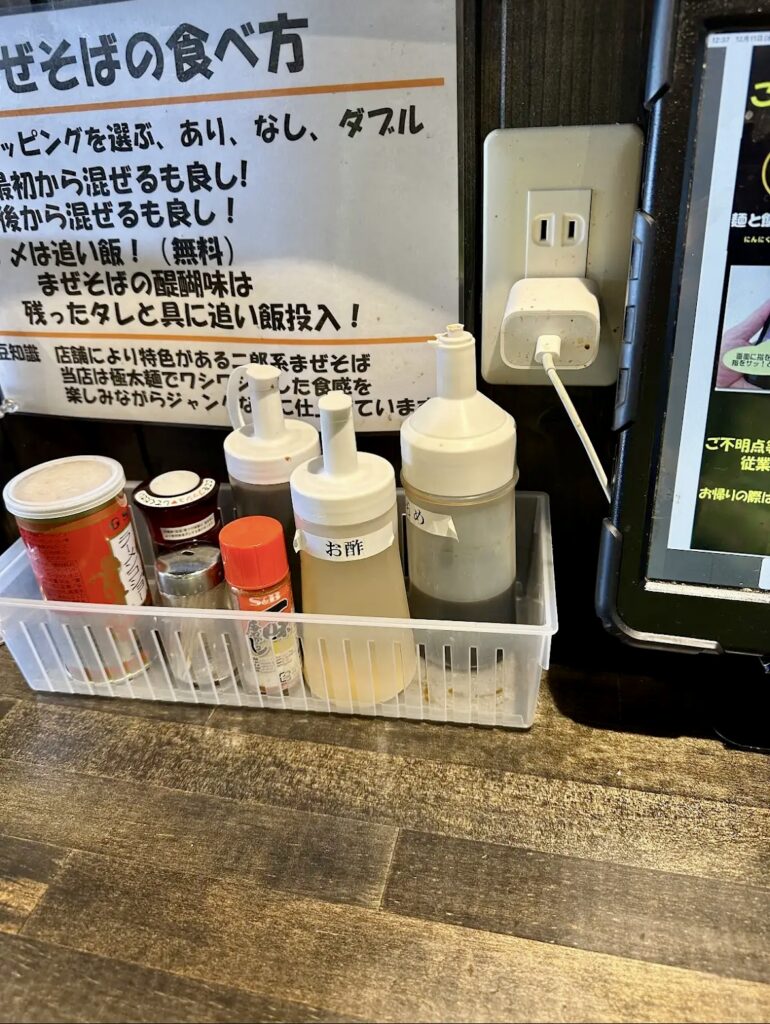 スープに浸して食べるもよし、卓上調味料のからめダレをかけて食べるもよし。