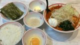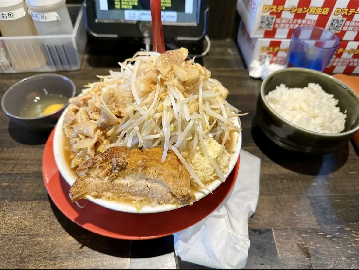 極太麺、やさい大、ニンニク多め、アブラ多め、ライス中、生卵